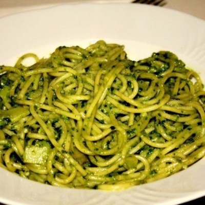 Spaghetti ao molho de manjericões orgânicos frescos, pecorino romano DOP e pinoles italianos