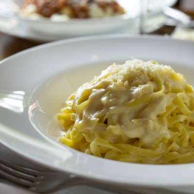 Fetucine artesanal ao molho branco à base de queijo Grana Padano, manteiga e creme de leite fresco